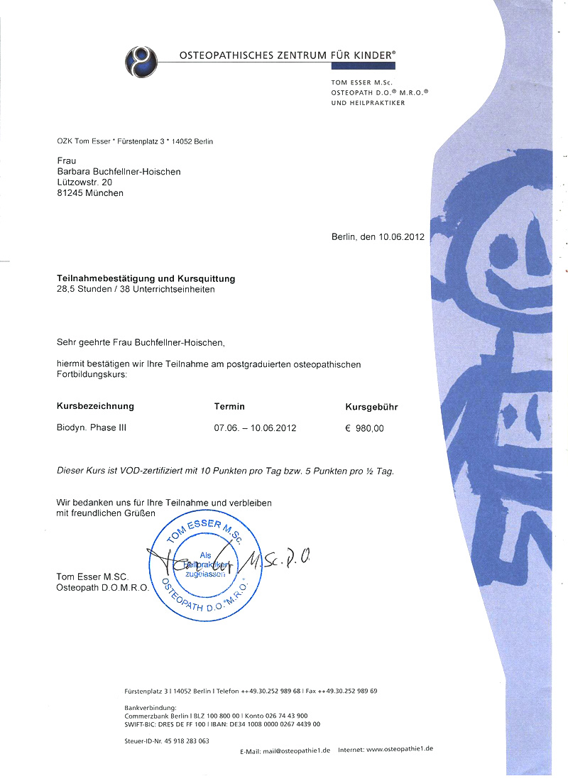 - 2015: Ausbildung Biodynamische Osteopathie - Pädiatrie und Forbildung Biodynamische Pädiatrie 3