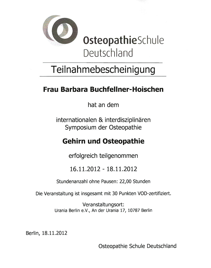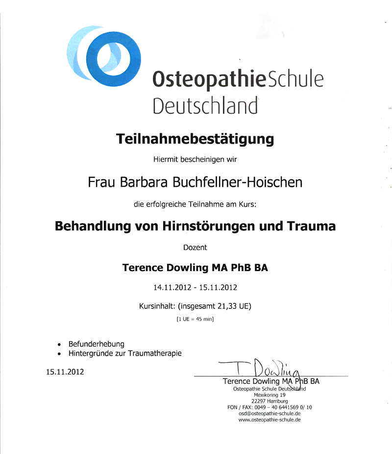 - 2014: Fortbildung im Osteopathisches Zentrum für Kinder, Berlin